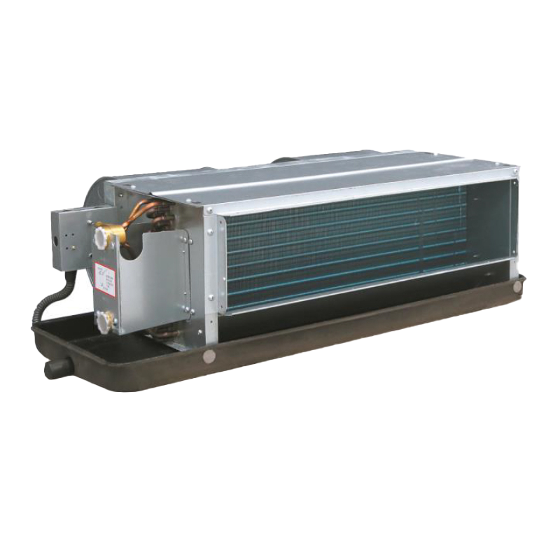канальный фанкойл, средненапорный, мощность охлаждения 12 600 Вт, мощность обогрева 10 800 Вт, расход воды 34 л/мин, вид фанкойла: четырехтрубный, тип вентилятора: центробежный, расход воздуха 2 380 куб. м/ч, перепад давления 50 кПа